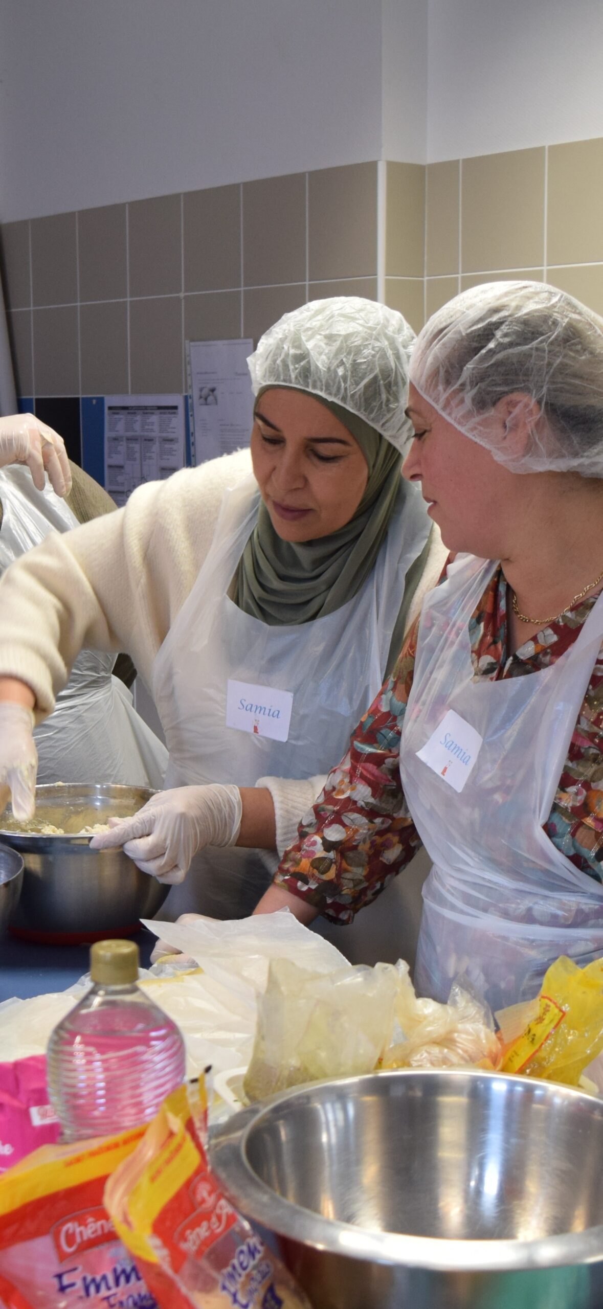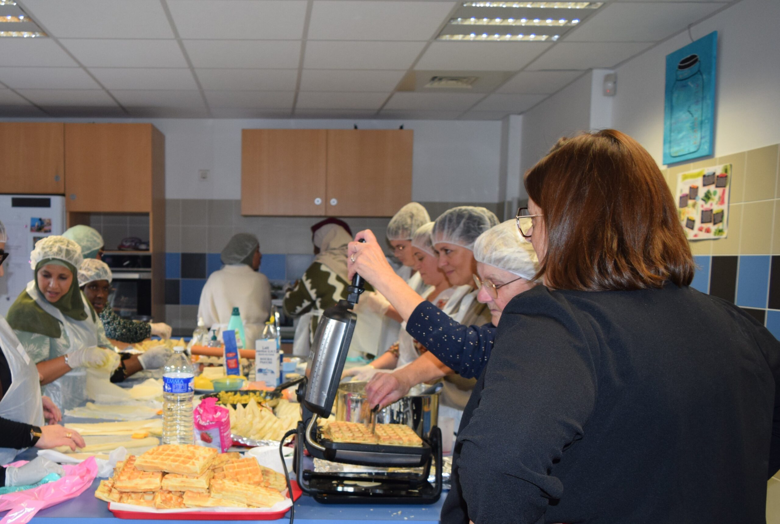 Nous avons préparé une centaine de samoussas (farce curry, thon et viande hachée) ainsi que de gaufres gourmandes, accompagnées de chantilly et de caramel au beurre salé . La cuisson des gaufres était parfaitement maîtrisée par Annick, et tout le monde a pu déguster ses créations ensemble.