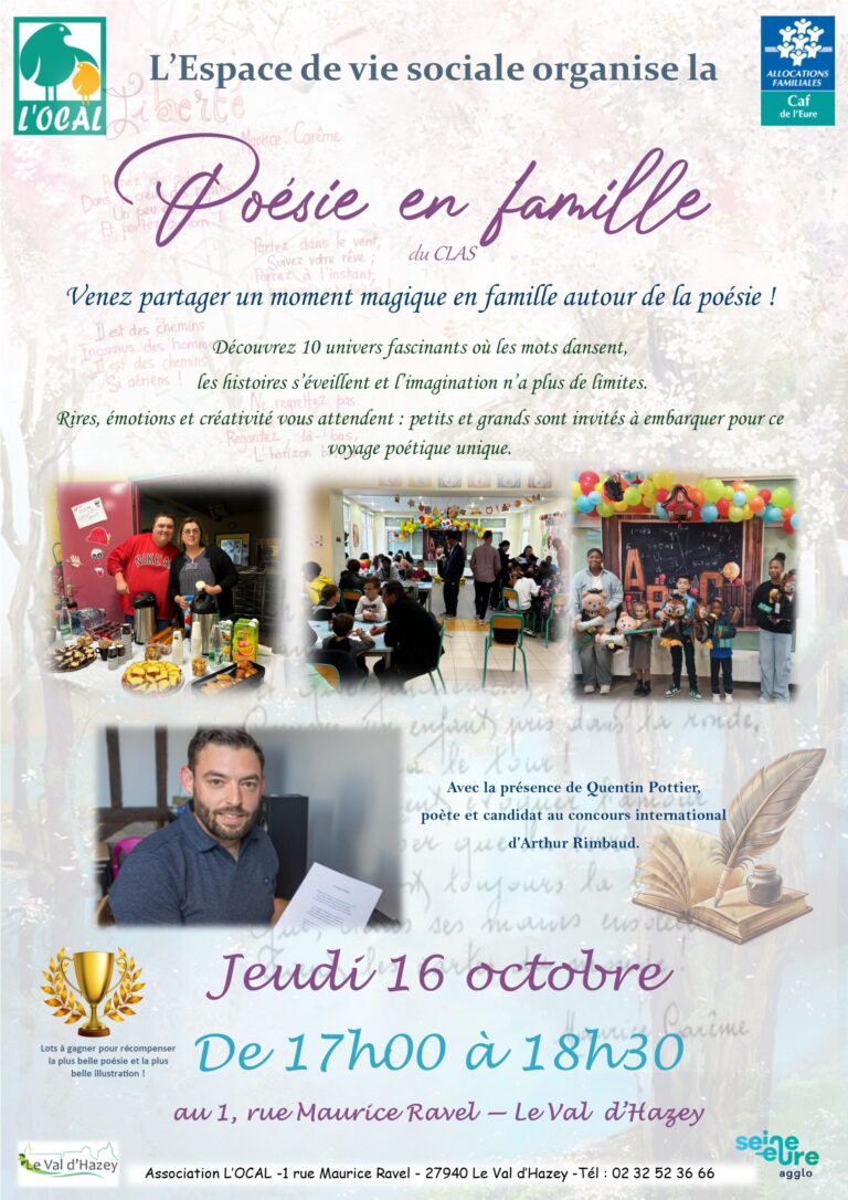 Dans le cadre de l’accompagnement à la scolarité (CLAS), l’équipe de l’OCAL invite les familles des enfants inscrits à participer à une animation poétique en famille, le jeudi 16 octobre, de 17h00 à 18h30, pour tous les groupes de primaire et de collège.