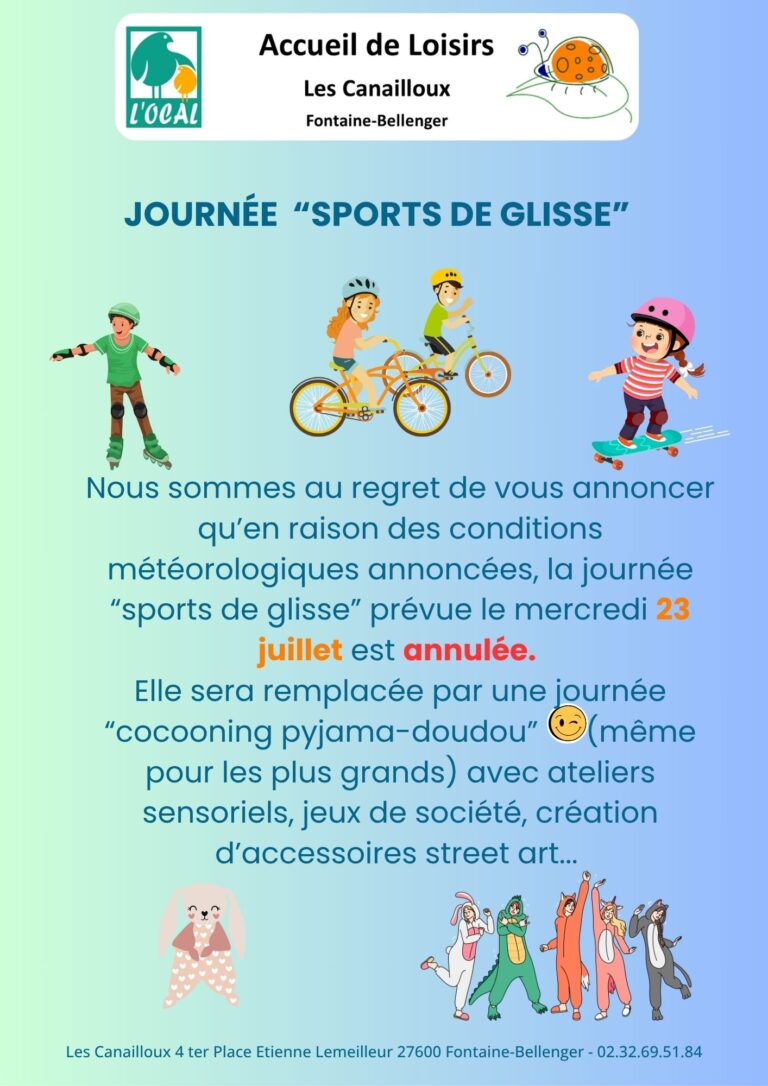 Du fait des conditions météorologiques de cette semaine, nous sommes au regret de devoir annuler la journée « sports et glisse » prévue demain, mercredi 23 juillet.